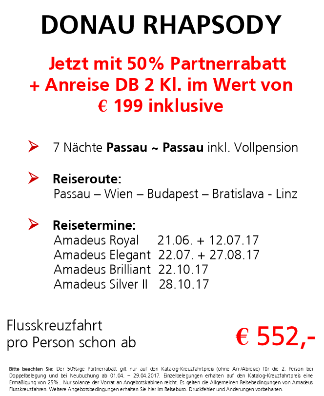 25% Rabatt und Bahn gratis auf verschiedenen Rhein reisen und auf der Donau.