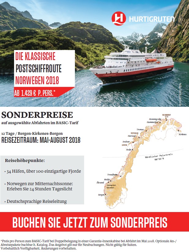Spezialpreis für die 12-tägige Postschiffroute von Mai bis August 2018!