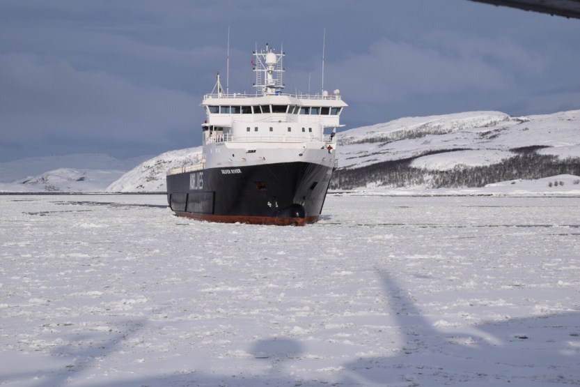 Die Abfahrt um 12:30 Uhr verzögerte sich durch viel Eis im Hafen von Kirkenes. Wir benötigten erst die Hilfe eines großen Frachters, der uns eine Fahrrinne ins Eis bahnen musste.